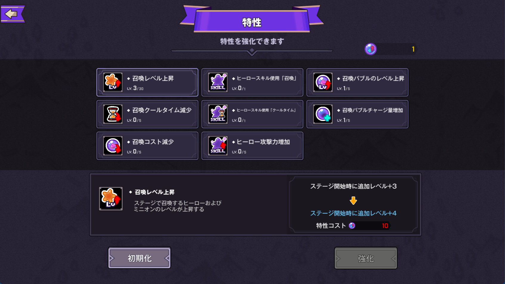 出撃時のレベルや出撃バブルの減少など有利に進めるための強化。