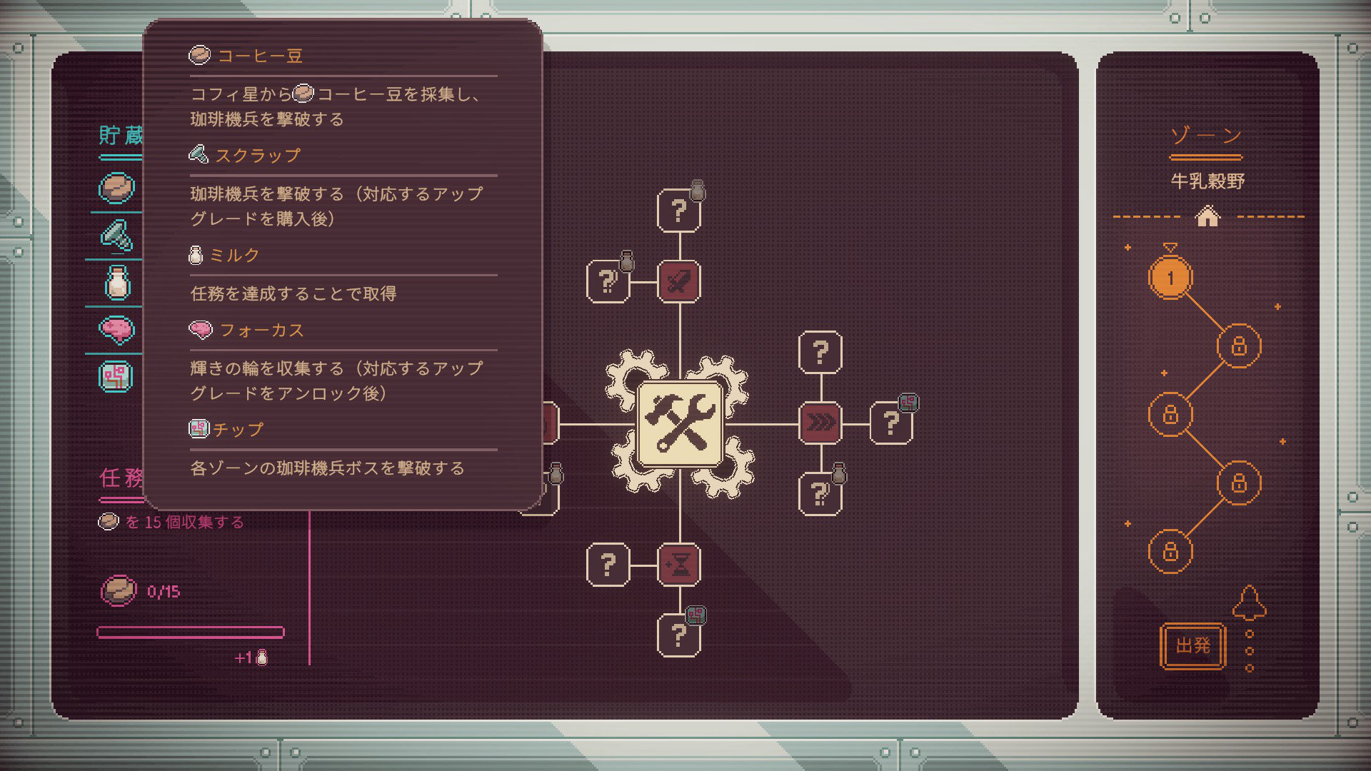 敵を倒してコーヒー豆を手に入れて徐々に強化。