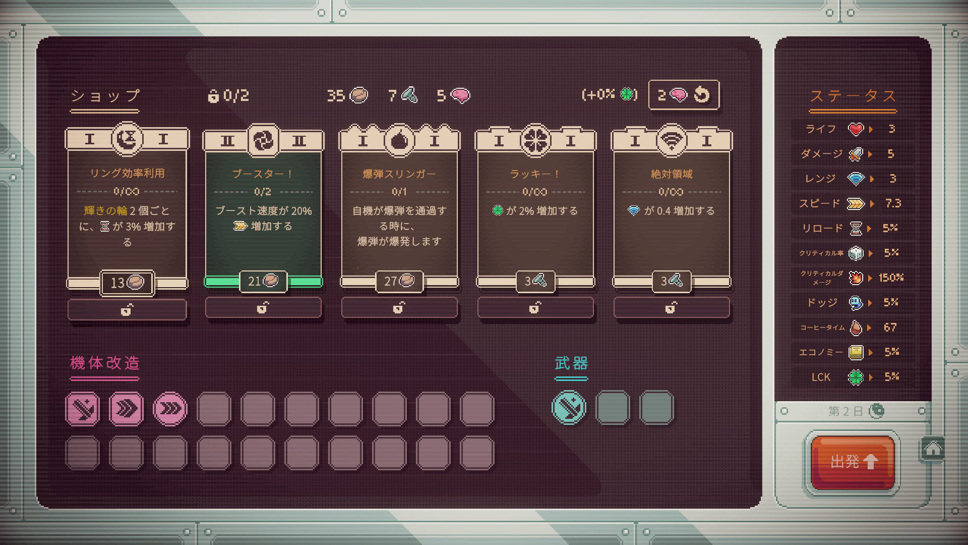 こちらは1ステージ後に強化を選んだり購入をして21ステージ生存するゲーム。