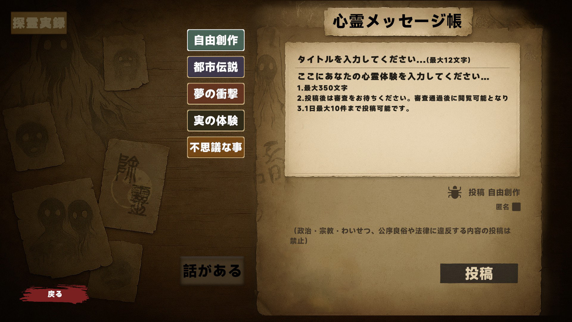 心霊体験を投稿する事もできます、投稿するとアイテムと実績もあるぽい。