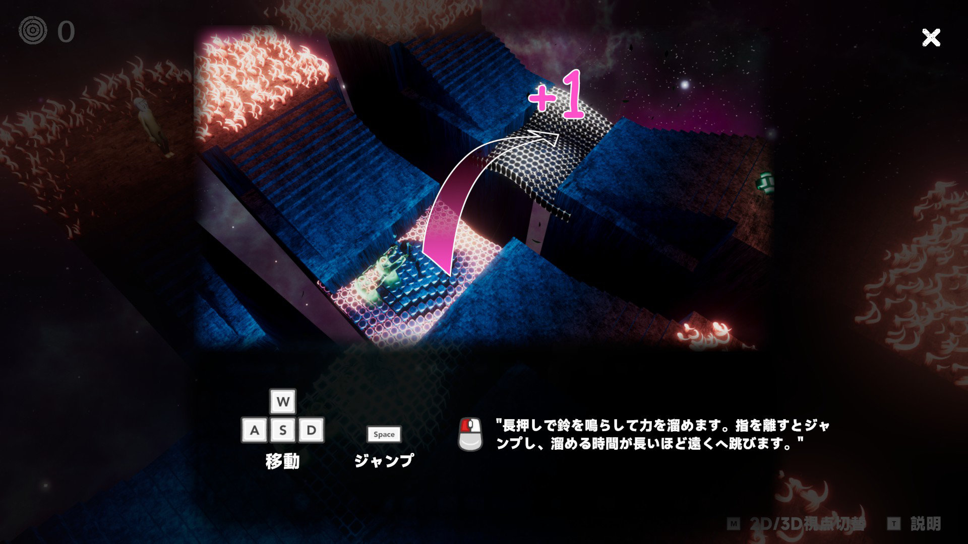 マウス長押しで鈴がなるのでその回数でジャンプ距離の調整。